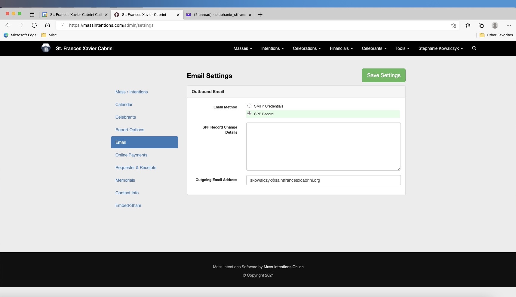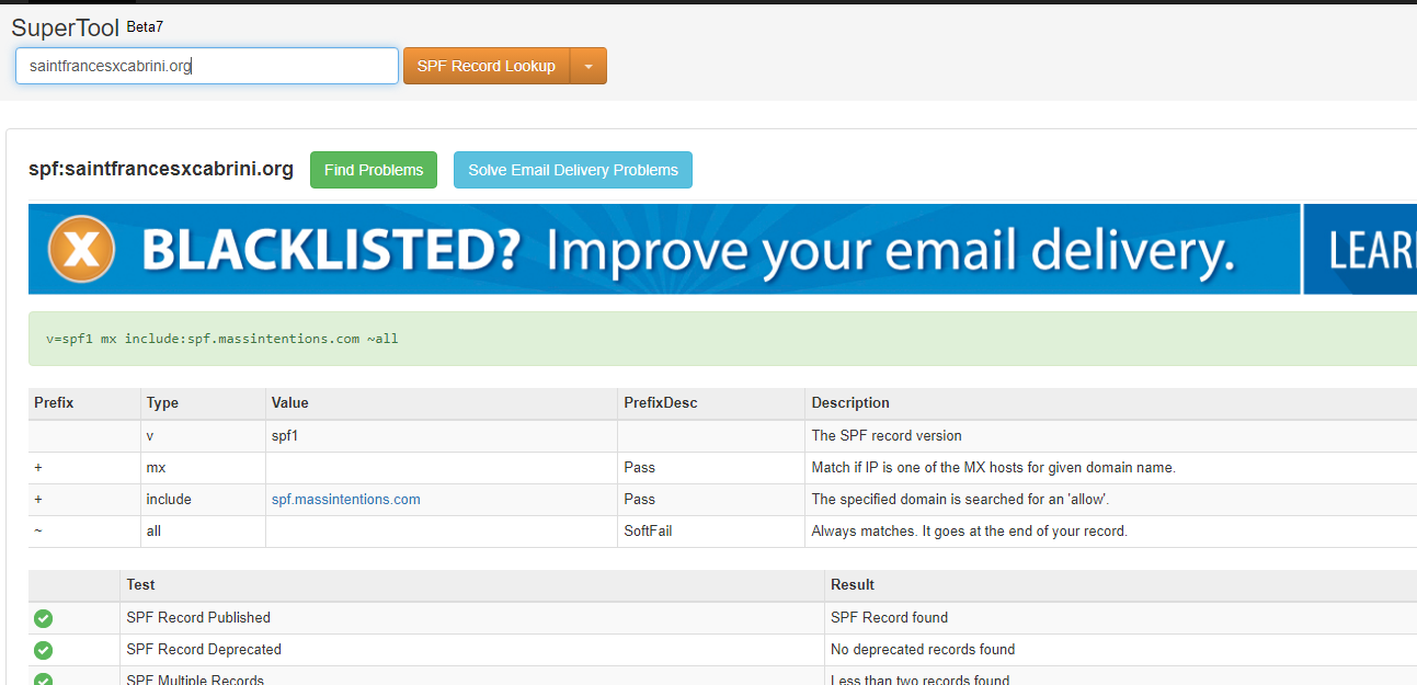 A Domain Name Server record must be created. It’s called an SPF record. Someone with access to your Domain Registrar (Tucows, Go Daddy, etc.) would have to log in, create or edit one and place the following in the SPF record: include: spf.massintentions.com (http://spf.massintentions.com/) ~all