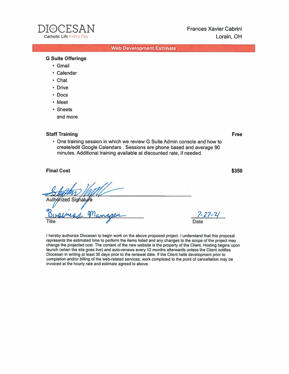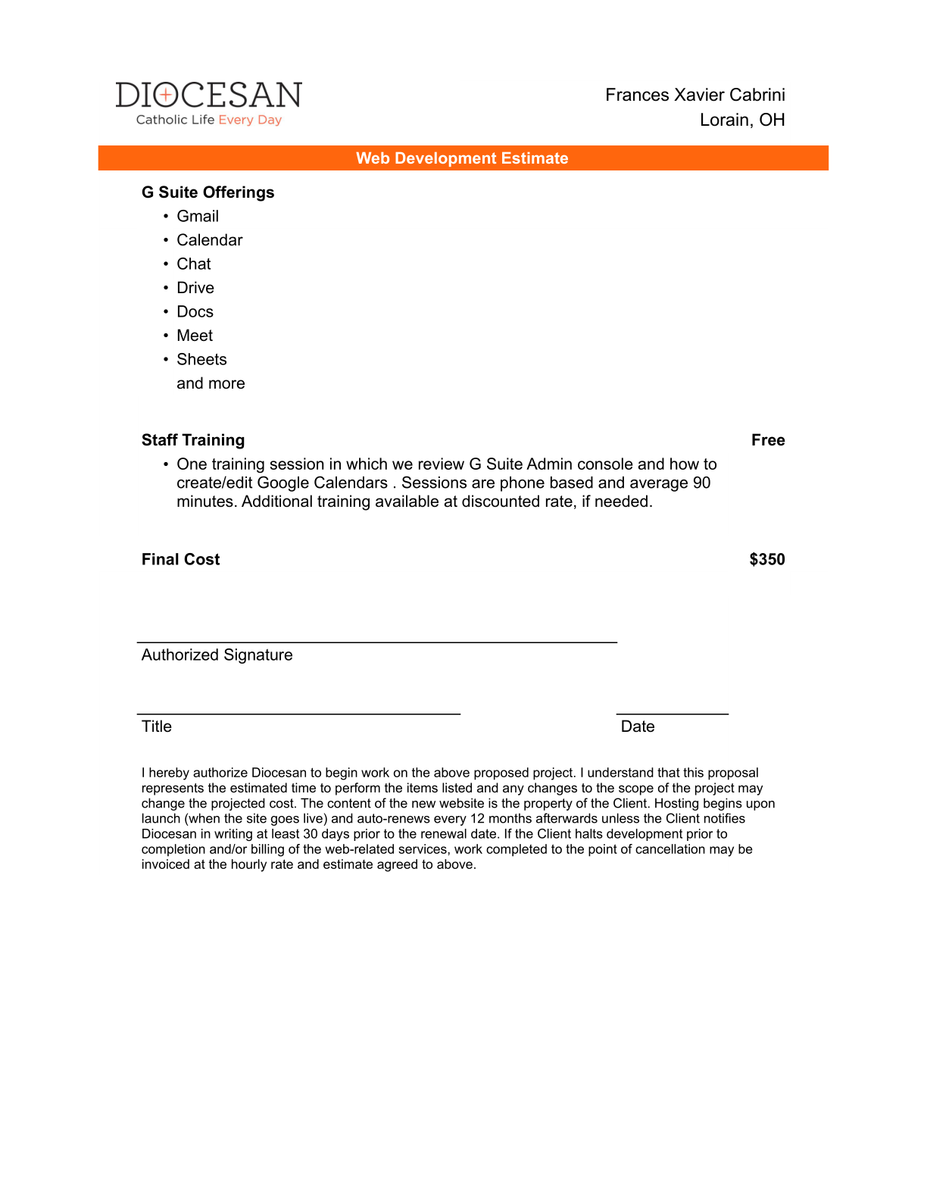As we discussed over the phone, I have created a proposal for Diocesan to set up your G Suite account. When we get the signed proposal returned, we can begin the process.
