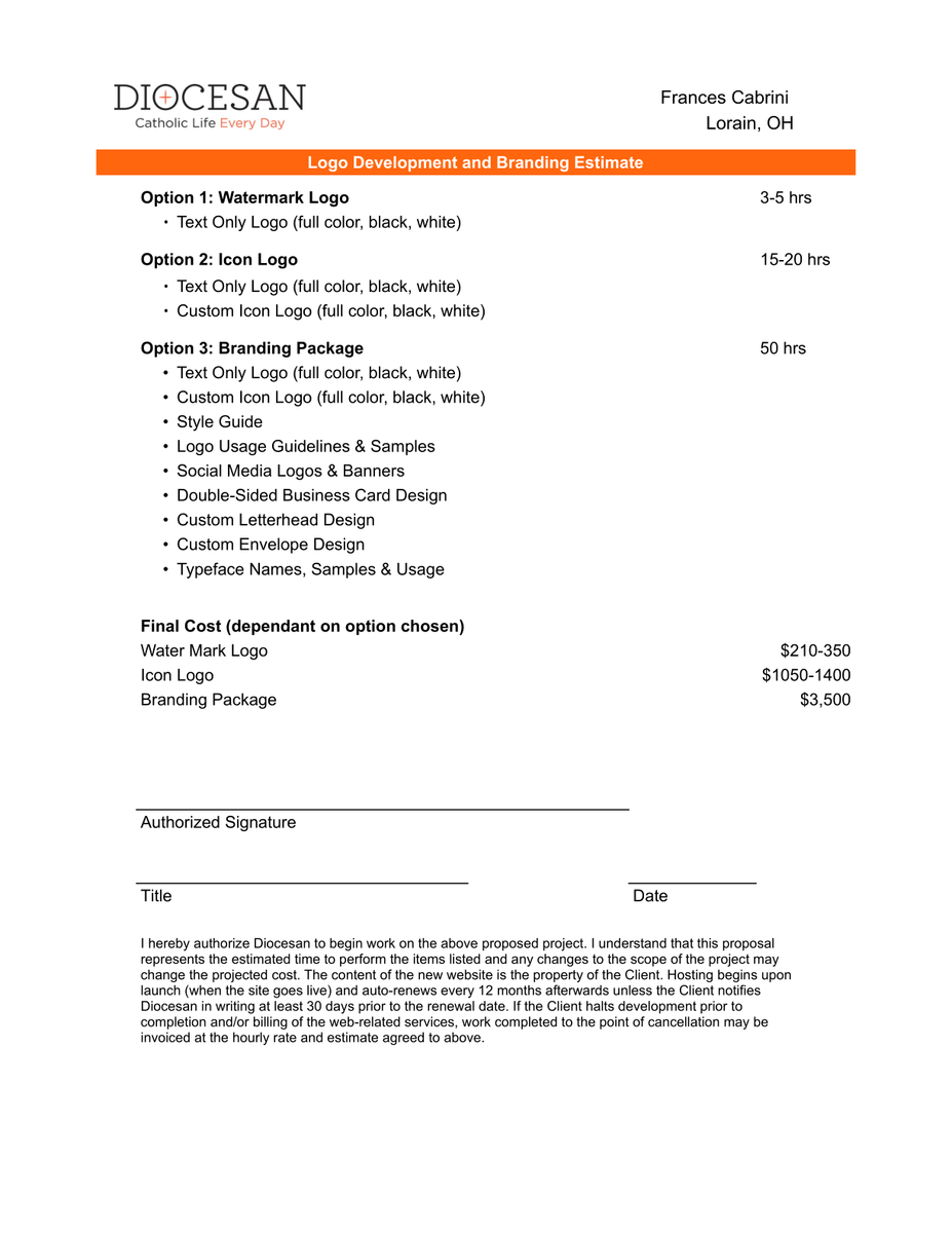 The attached proposal walks you through each phase of the project. We have included the amount of time each phase would take to complete and that is how we arrive at our final cost. There is also a line item if you wanted us to purchase a new domain name for you. Lastly, I have included a proposal for our logo creation and branding package.