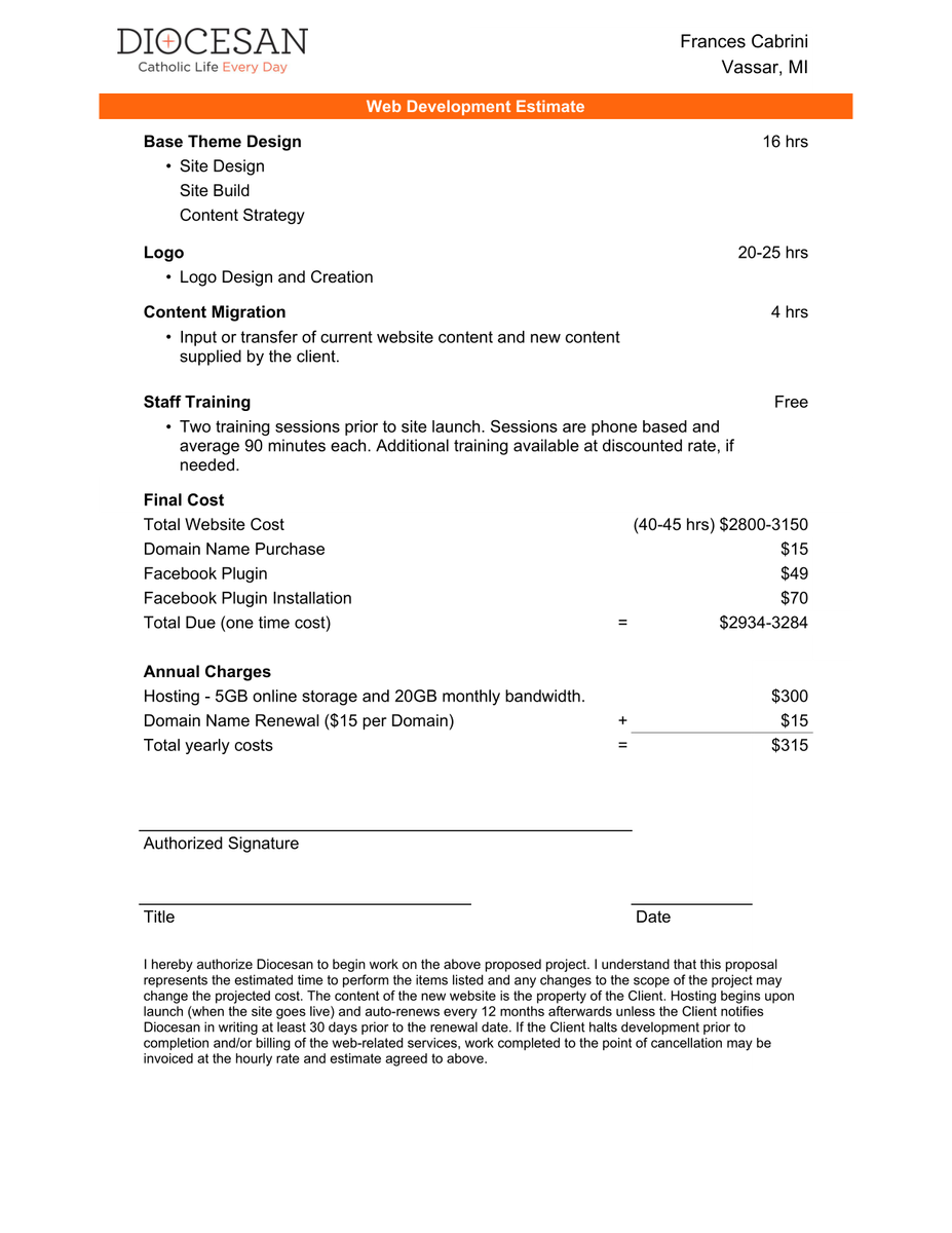 The attached proposal lists each step of the process we use to create your new website as well as what we will be doing. I have also included logo creation as a separate line item. Also, I have included the Facebook plugin price, installation of the plugin, and also the one-time purchase price for your domain name.
