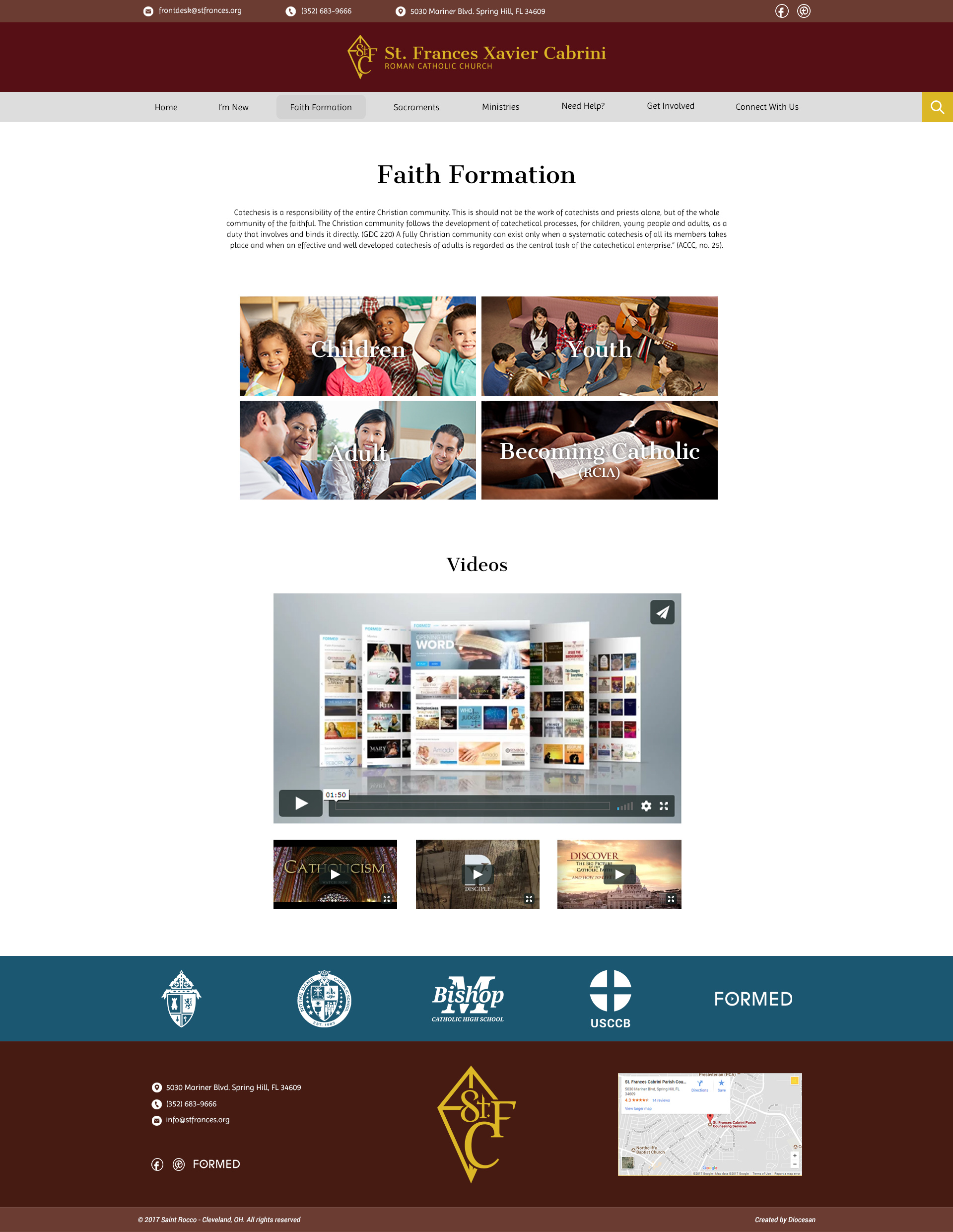 These pages include a Contact page, Ministries page (w/ Tabbed sections for each ministry) and a page for Faith Formation (w/ Videos placed in a way to fit the page better)