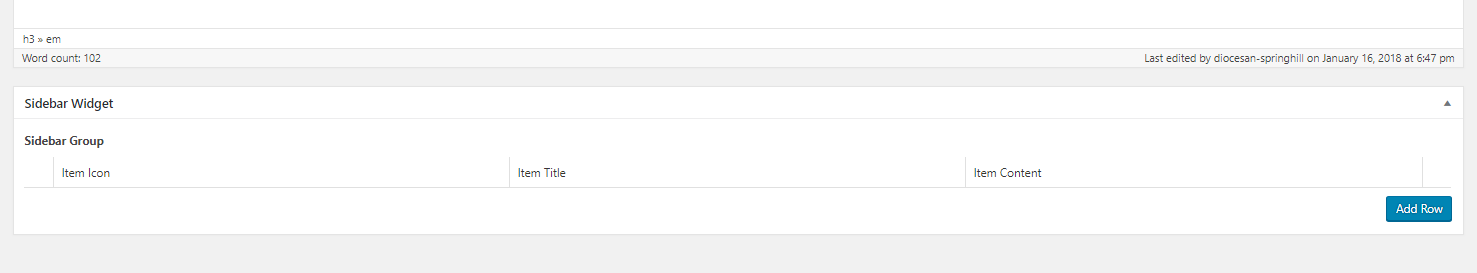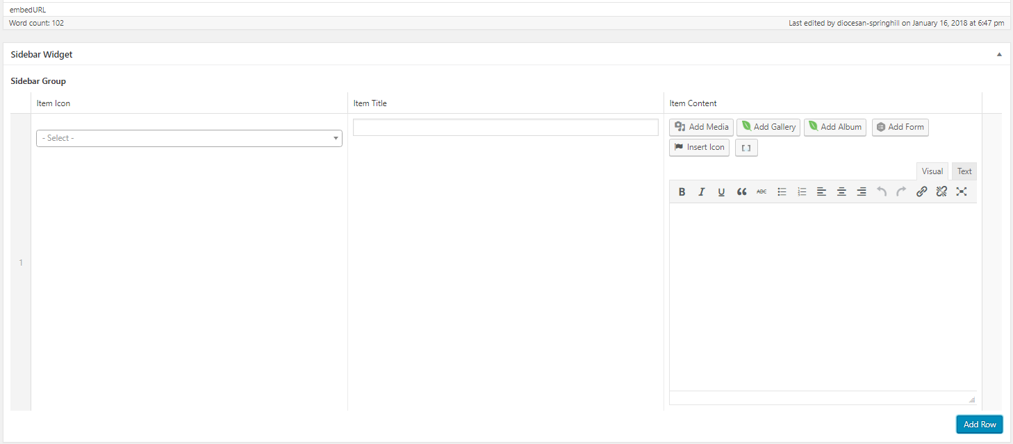 Once you click "Add Row" it will open up another editor where you can give the tab a title (Item Title) and content (Item Content). Icons are not used.