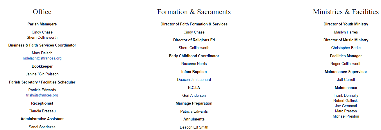 Parish Secretary / Facilities Scheduler: Patricia Edwards (trish@stfrances.org (mailto:trish@stfrances.org))