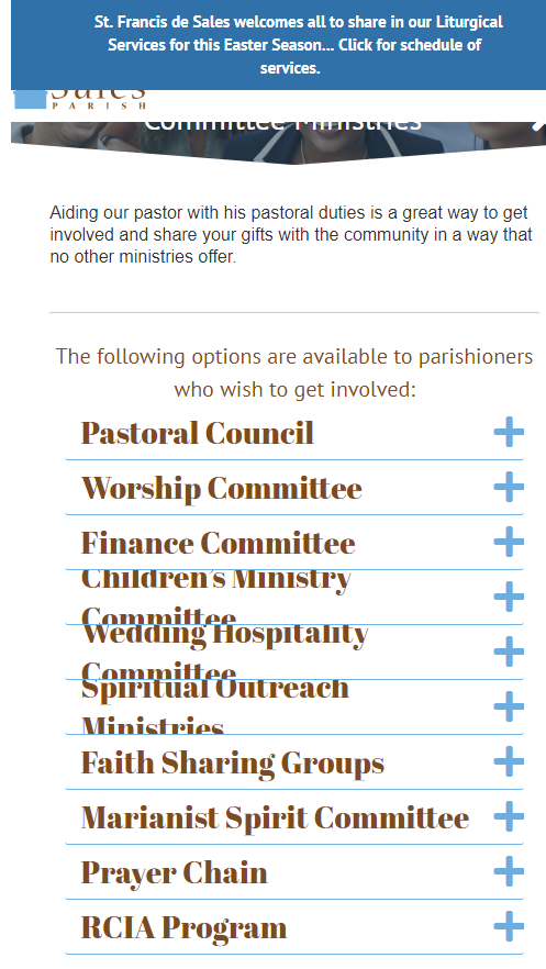 ✔ Spoke with Phil, he's wanting to know if we can shrink the fonts on the accordions (Ministry page, example) - it's hard to read and is huge on mobile (he understands mobile is still being worked on) - but he'd like it a smaller, easier to read, and so that it doesn't go to 2 lines & overlap, see screenshot below: