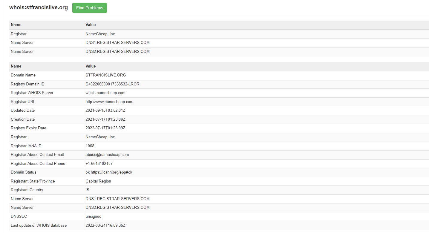 Here is what we know. The Domain was purchased according to our records in July of 2021. Fr. Basso told me on the phone today that he did not purchase a domain and that he wanted me to do that. The time frame that Mary is saying Father Basso told her he purchased the domain is consistent with the publicly available records of the domain July 2021 domain purchase. See attached domain purchase record, this is publicly available information: https://mxtoolbox.com/SuperTool.aspx?action=whois%3astfrancislive.org&run=toolpage