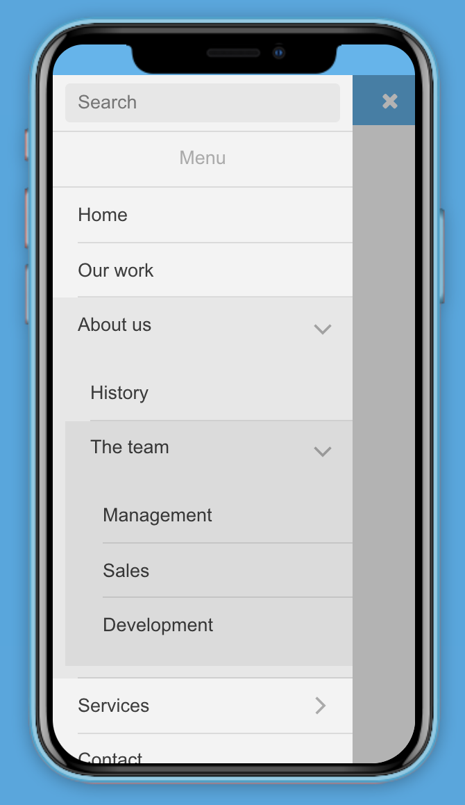 You have let me know that you would like the mobile menu to open from the left and have dropdowns instead of slide outs/overs.