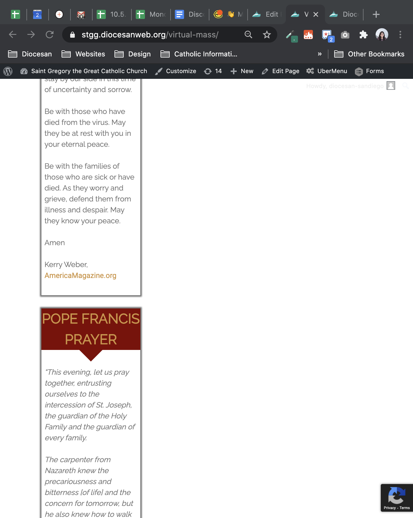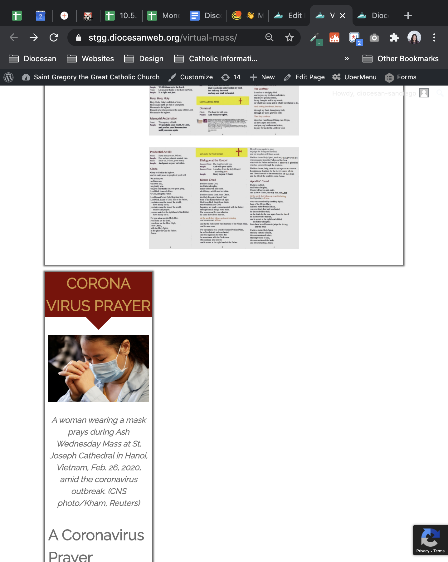 From the list: Pages ✔ ACF Columns stack but don't change size and should. Veronica A. added this on Oct 02, 2020 Completed Oct 05, 2020 by Sam P. Assigned to Sam P. Due on Oct 05, 2020 Notes https://stgg.diocesanweb.org/virtual-mass/ Screen Shot 2020-10-02 at 4.38.46 PM.png 617 KB • Download Screen Shot 2020-10-02 at 4.39.51 PM.png 289 KB • Download Comments & Events Sam Pohlman completed this to-do. Oct 05, 2020 at 1:56 PM
