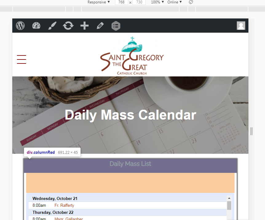 From the list: Build ✔ Mobile - Red Bars - Shrink title text by 10 px Veronica A. added this on Oct 20, 2020 Completed Oct 21, 2020 by Sam P. Assigned to Sam P. Notes Mass Schedule – Saint Gregory the Great Catholic Church.png 148 KB • Download Comments & Events Sam Pohlman completed this to-do. Oct 21, 2020 at 3:58 PM Veronica Alvarado, Project Manager Please do the same for smaller than 1024px wide (small laptop) Oct 21, 2020 at 6:03 PM Notified 1 person Veronica Alvarado re-opened this to-do. Oct 21, 2020 at 6:03 PM Sam Pohlman, Web Developer It should be font 20px on smaller than 1024 screens. image.png 352 KB • Download 👍 Oct 21, 2020 at 6:11 PM Notified 1 person Veronica Alvarado, Project Manager Check it out on this page:https://stgg.diocesanweb.org/welcome/mass-schedule/ Oct 21, 2020 at 6:29 PM Notified 1 person Sam Pohlman, Web Developer 768px wide. It's still 20px font. image.png 115 KB • Download Oct 21, 2020 at 6:31 PM Notified 1 person Veronica Alvarado, Project Manager That should work. At 775 is when Reconciliation starts getting really close but that's going to be rare Oct 21, 2020 at 7:01 PM Notified 1 person Sam Pohlman completed this to-do. Oct 21, 2020 at 7:02 PM