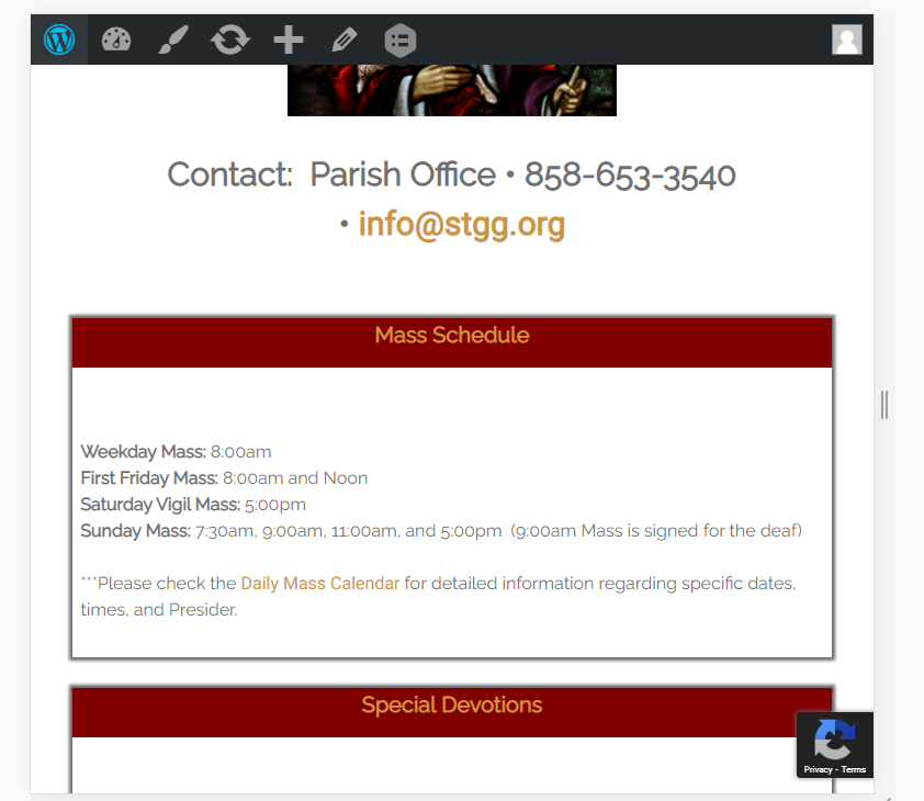 Veronica Alvarado, Project Manager Check it out on this page:https://stgg.diocesanweb.org/welcome/mass-schedule/ Oct 21, 2020 at 6:29 PM Notified 1 person
