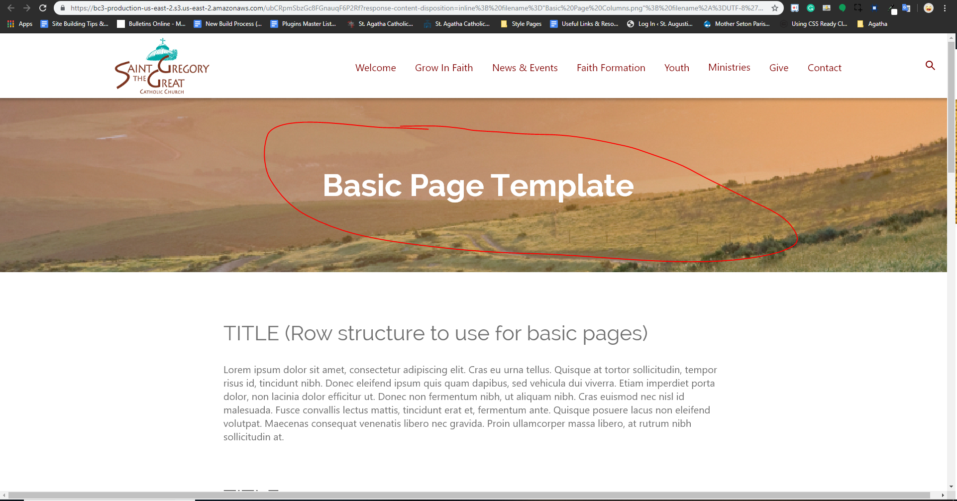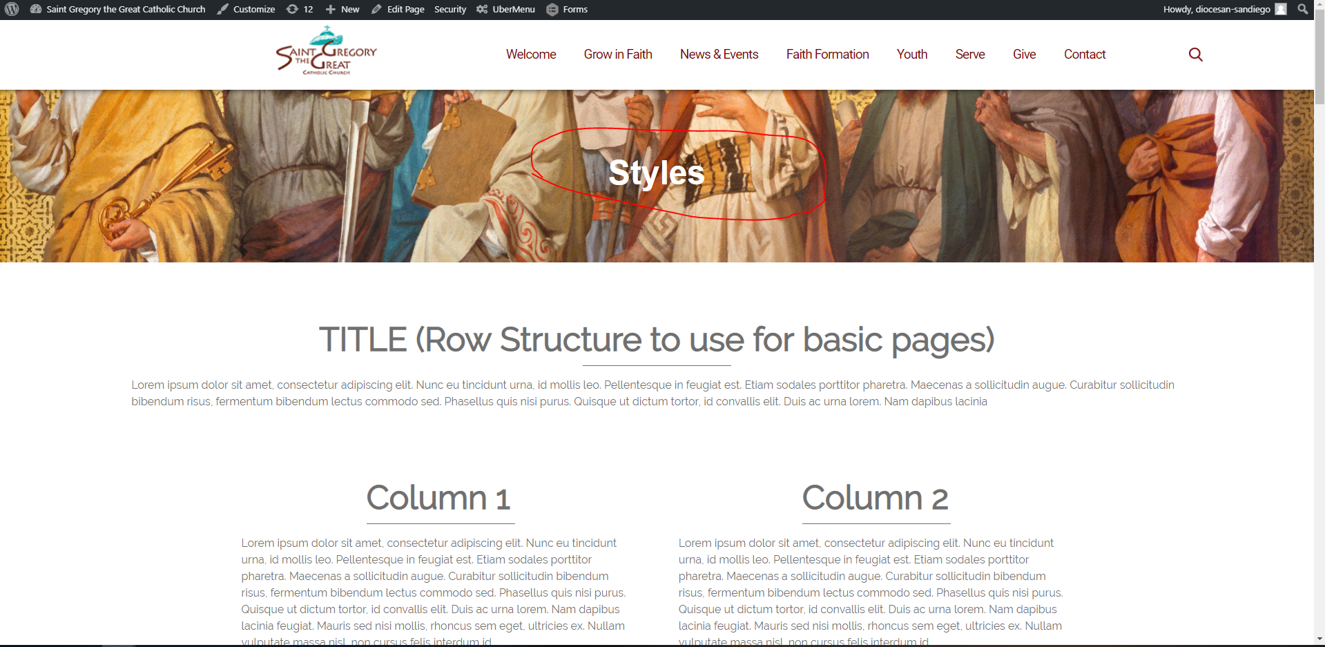 Page Title judging from the proof needs to be bigger. Not sure how much, but definitely bigger. It looks like the featured image needs to be slightly taller too. Not sure if this has been brought up earlier, but looking at the two side by side, I don't think it is quite there on the featured image size or the page title size. https://stgg.diocesanweb.org/styles/