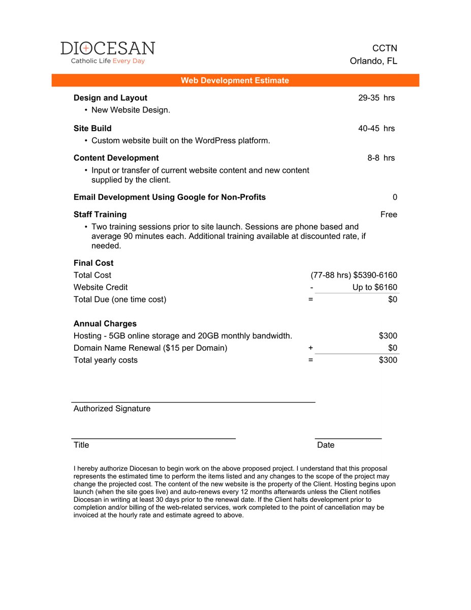 I hope you are well! I am sending the quote for the CCTN site. We have it in your bulletin contract that the cost of the HFO and CCTN sites will be covered by Diocesan. While we are over the original estimated cost for the two sites (after further discussion) we will still be honoring the contract and covering the cost of both sites.