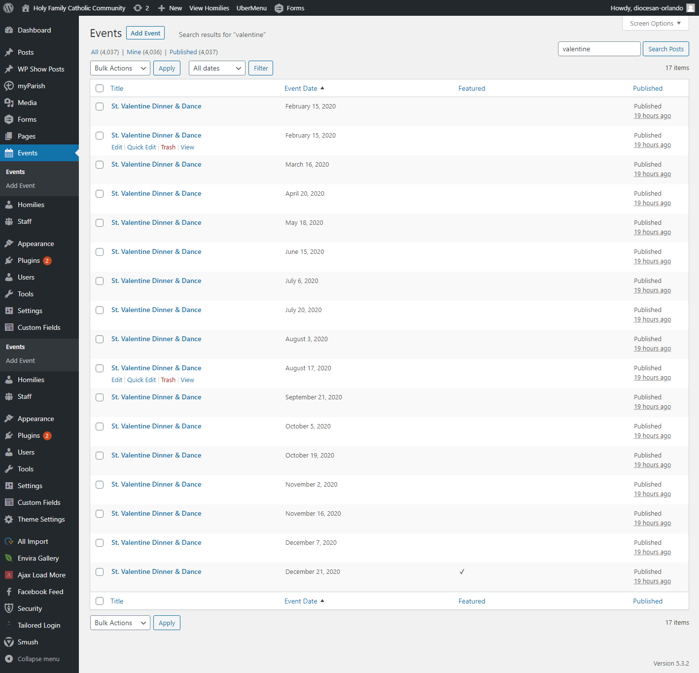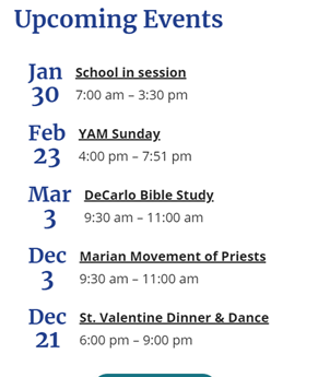 Once we are launched, please be sure to set up some featured events. I have set the Men of Holy Family Pancake Breakfast (Feb 2) and St. Valentine's Dinner & Dance (Feb 15) as featured events for now as test items since they were prominent in your bulletin. I also added content to the St. Valentine's Dinner & Dance post to test.