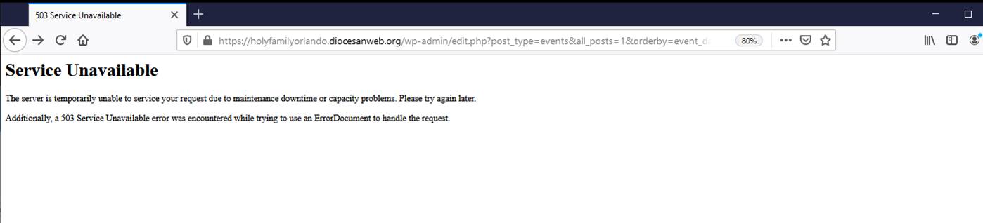 While I was cleaning up the events, I ran into this error. The 503 Service Unavailable error would occasionally come up when your techs were working on the site, but this is new.