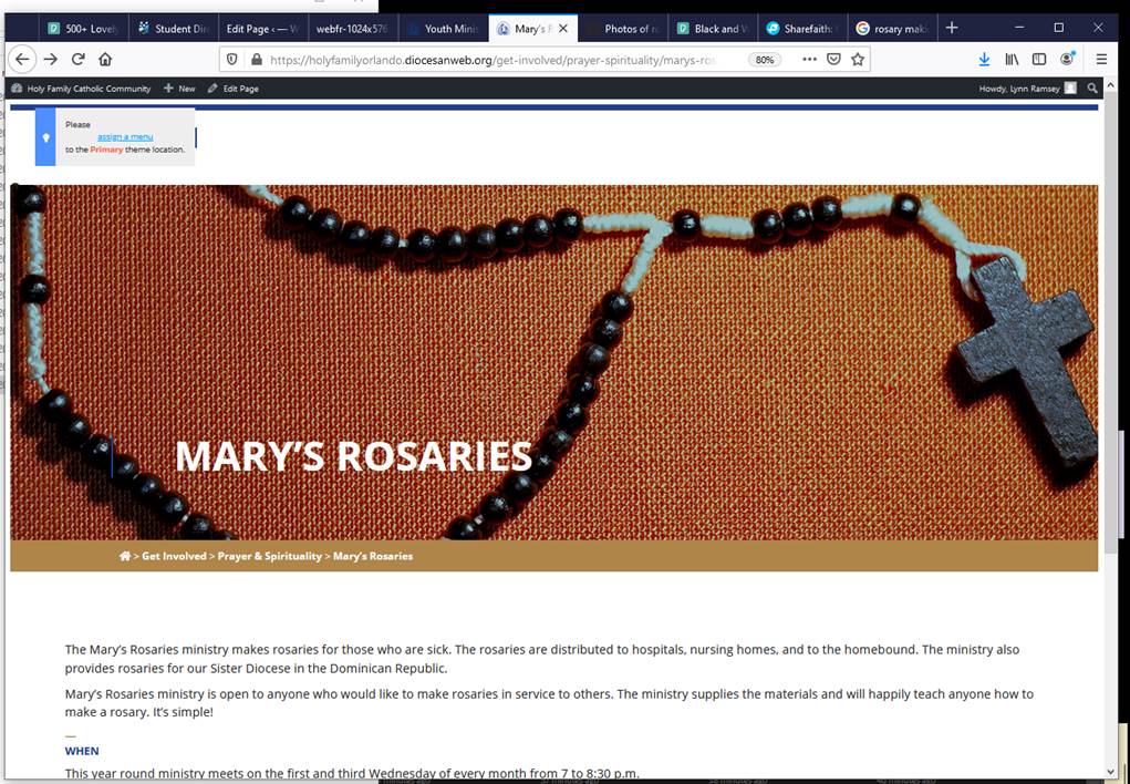 * Still waiting on Dan R to update us on best options for an event calendaring tool. He said he'd be doing that early this week. I'd still like to wait for our internal decision on that before next training. Training won't be this week. Hopefully next. I'll get back to you at end of this week with further timeline update. * On the plus side, Lynn and I are working on new site and copy and I'm building "placeholder" pages that I hope will expedite the migration internally. Unless you have other thoughts that would save hours/$, I'd like to try to have Lynn and I do the lion's share of other page migrations and finalize the site map priorities, with you guys handling formatting of the pages into our templates. This gives Lynn and I ample opportunity to work through variations and find best practices based on your first training, and we're keeping a running list of questions/issues that we can address when we next meet. * That said, I have a few Qs at this point and I hope either a quick, scheduled call to me (mobile: 407-394-7444) or an email response would work in the interim. You let me know how best we can address these items. I can pass along the knowledge to the others: * I noticed it's possible to manage Menus in "live preview" mode, which is a great way to see changes in real time w/o going back and forth between backend and frontend - can that be done for managing Pages as well? * I'm wondering if the color of the base copy font is a bit too light, not enough contrast. We'll discuss internally as well, but if we decide it is, can it be easily and uniformly adjusted across the site w/o going page-to-page? * I seem to be having an issue with a change in the look of the hamburger menu - check it out and let me know if you see it as well * Now that I'm adding pages and associating them with other pages as 'parent', 'child', etc. should those also be showing up in the drop-down menu? * I've created some links from copy inside pages to other pages on the site, but the URL is for the development site. Will those automatically update to the real page links once we go live? If not, should I not create links yet? * I'd like to use some of the mockup pages, starting with the CYM page, as a working template and add copy, links, etc. I tried going to it and editing, but it's not allowing me to do so (at least I'm unable to determine how). Is that something you need to do on your end? * Dcn. Spencer Silvers is both a deacon and part of the admin staff. How do we create a page for both, using the background for his deacon page, but just his title and contact info for the admin page? * The "Mass Times & Homilies" page title just says "Homilies" when I click on it. I'm not seeing how to change it - other pages were not an issue to create/change a title. Is that b/c it was from a mock-up? * On the "group ministries" template pages, the default subheading starts with "Our....ministries:" - can we remove this since it may work for other pages we want to use the template for?