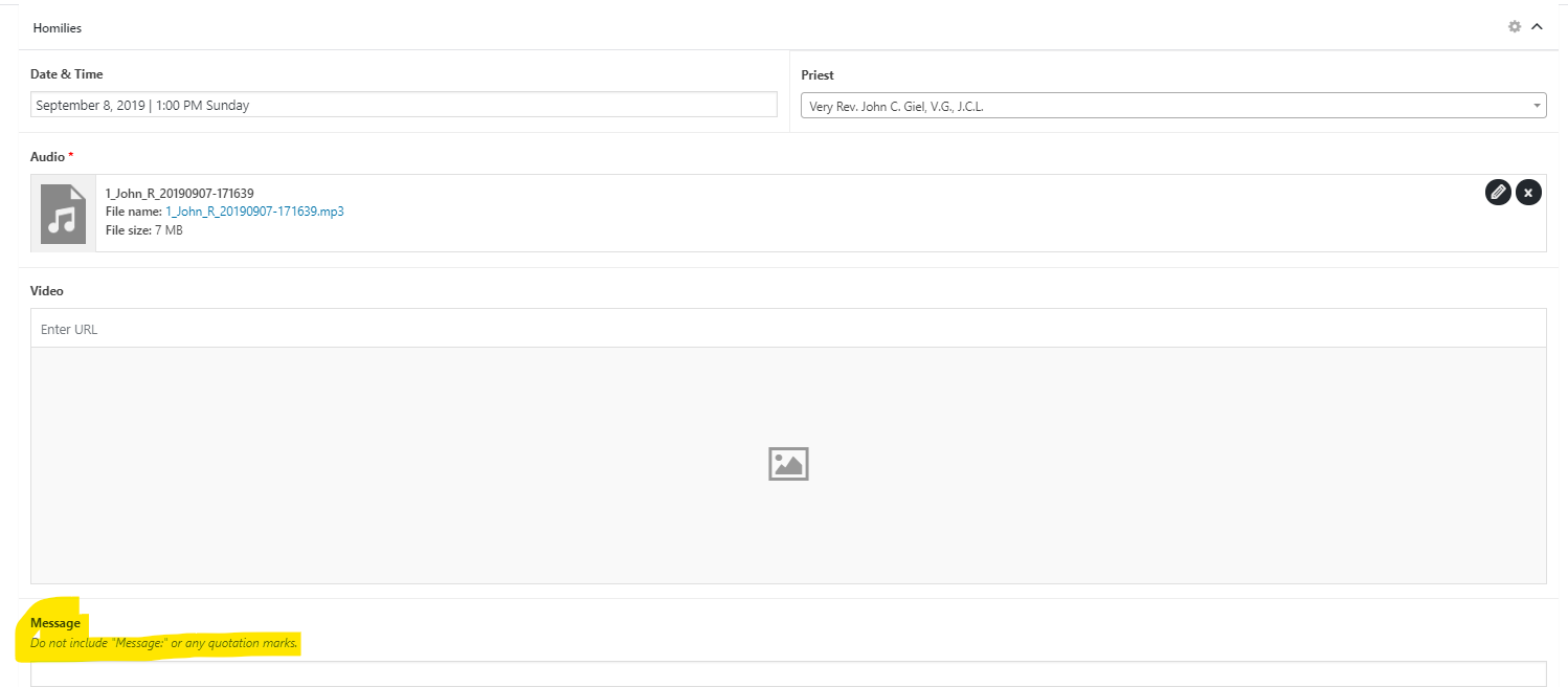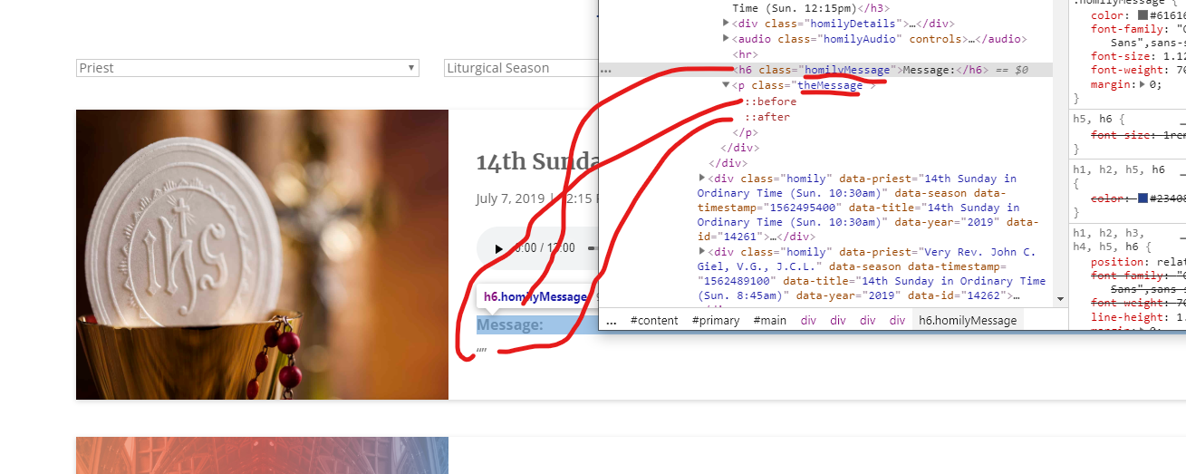 If the message field is left blank in the backend, which 95% of them are, then the Message should disappear and the quotes should disappear. I prefer Visibility: hidden instead of display:none in this case since it keeps the spacing the same for every homily, message or not.