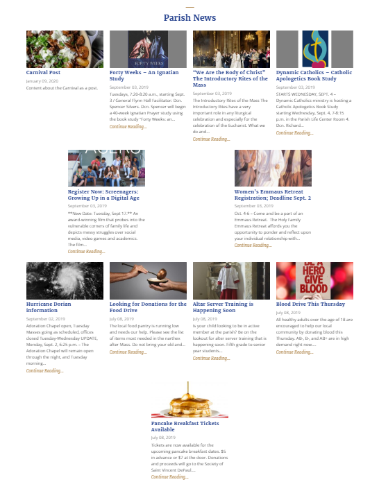 The title will remain "Parish News" but will display WP posts in a grid layout (2 rows of 4 posts) with Load More button below.