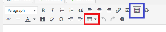 When you are looking at the editor, click on the button that I have highlighted above in blue. It should make a second row appear. Then click on the button highlighted in red, and you should be able to create a table/grid on any page that you would like.