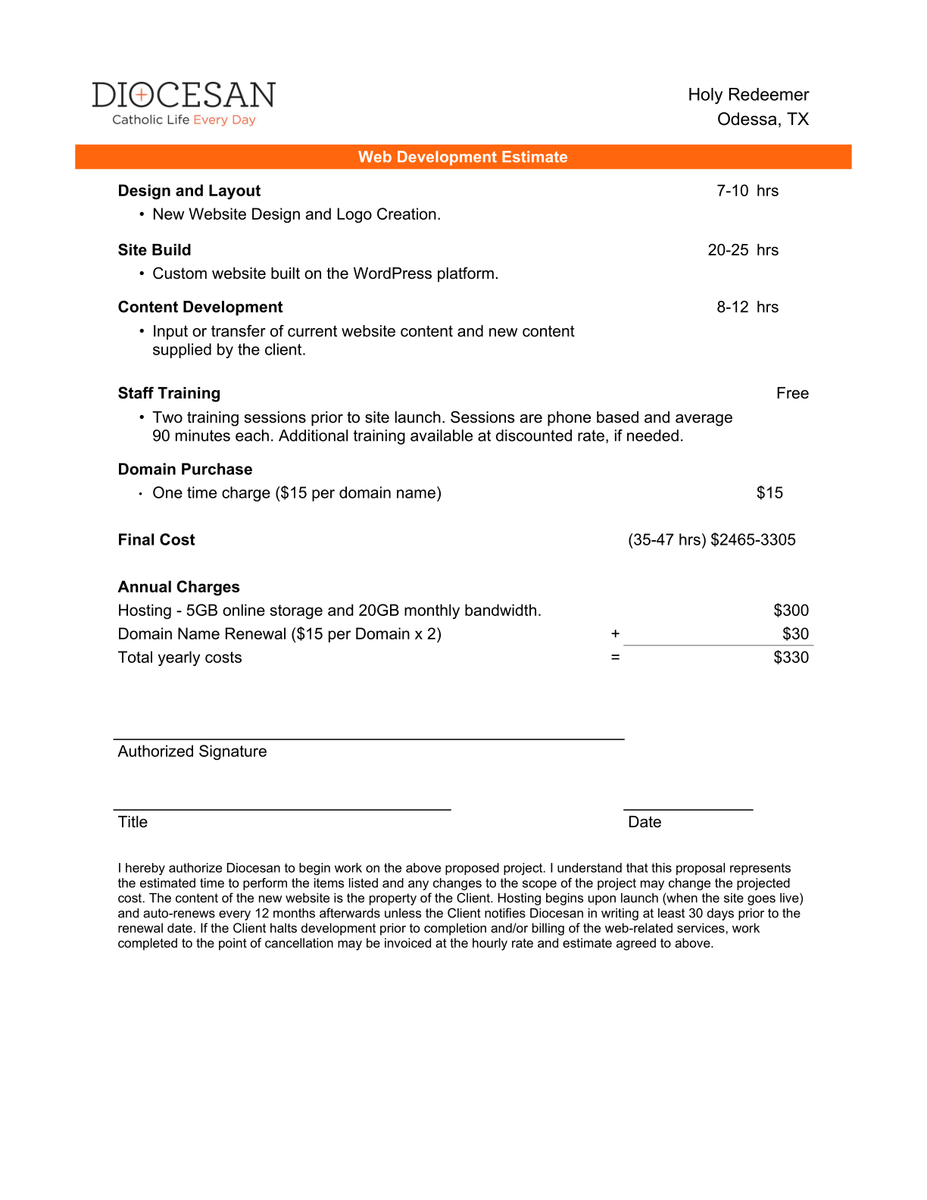 When we spoke about the domain, you mentioned that if possible you wanted to keep http://holyredeemerodessa.com/ I did some digging and found that holyredeemerodess.com and the .org version are currently registered to the church. The name that registered for the domains is Jo Ann Gomez and they are hosted by GoDaddy.com. If you would like to keep both of those and then have Diocesan host them along with your new website, we can work with you to transfer them to us. You are also able to keep them with GoDaddy.com. I have included this in the proposal.