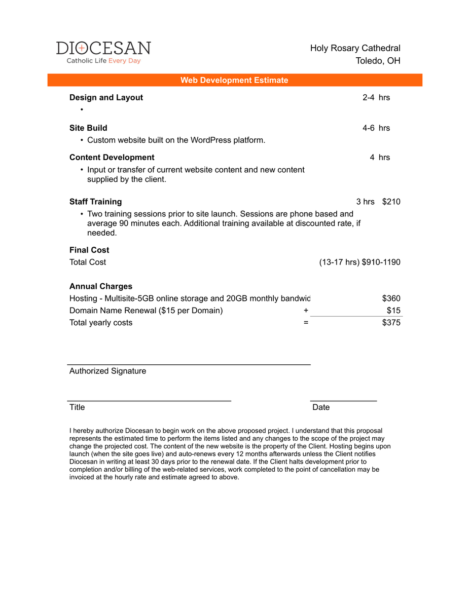 Alan, thank you for the proposal. We would like to go ahead and move forward with you and the DIOCESAN team for our new website. We enjoy your layout and the service you have provided to us thus far. Please let us know how to proceed in signing the contract.