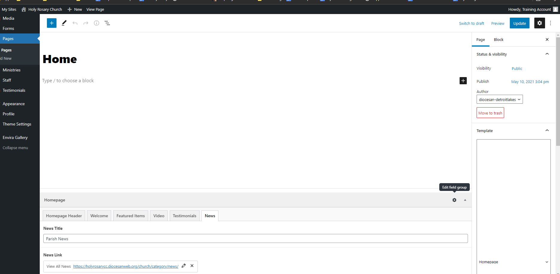 I have the option as training account (same privileges as parish users) to edit field groups on all three sites, Landing, Church, and School.
