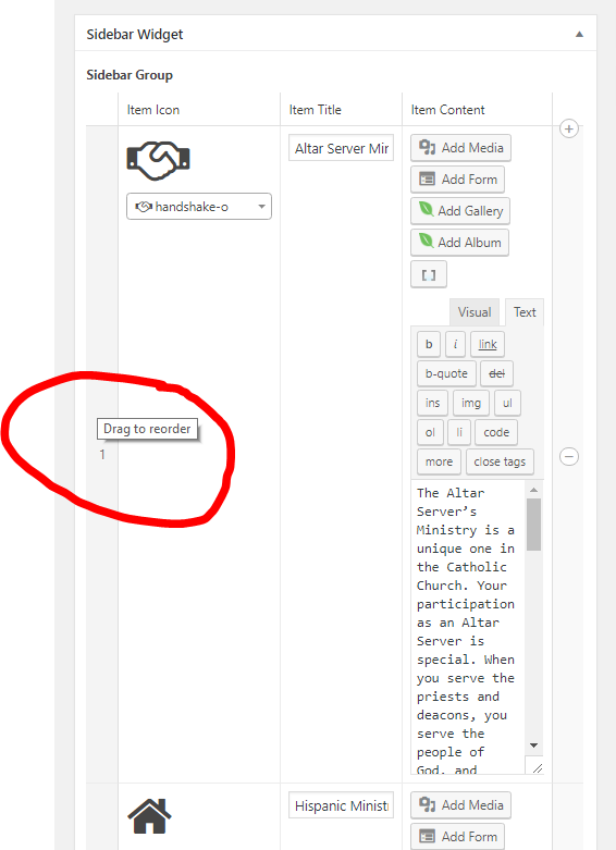 I'm working on Holy Spirit's updates to the webpage. I have a question... under Holy Spirit Ministries I replaced MOMS with LIFT. but now I see by doing that I messed up the alphabetical order. Is there a way to just move it? I looked under menus and appearance but I couldn't figure it out. Can it be moved or do I have to delete it and add it where it properly goes?