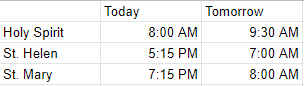 So I spoke with our developer, Sam, and his suggestion would be to expand the mass times banner on the homepage to be larger. It would be laid out like the table pictured below, with the "Today" and "Tomorrow" blocks moved to the top of the banner and the names of each parish listed out vertically along the lefthand side. Attached is also a rough mock-up that Sam was able to put together. When he actually codes it into the site it will have the parish names (like the table) and will be refined to look neater.