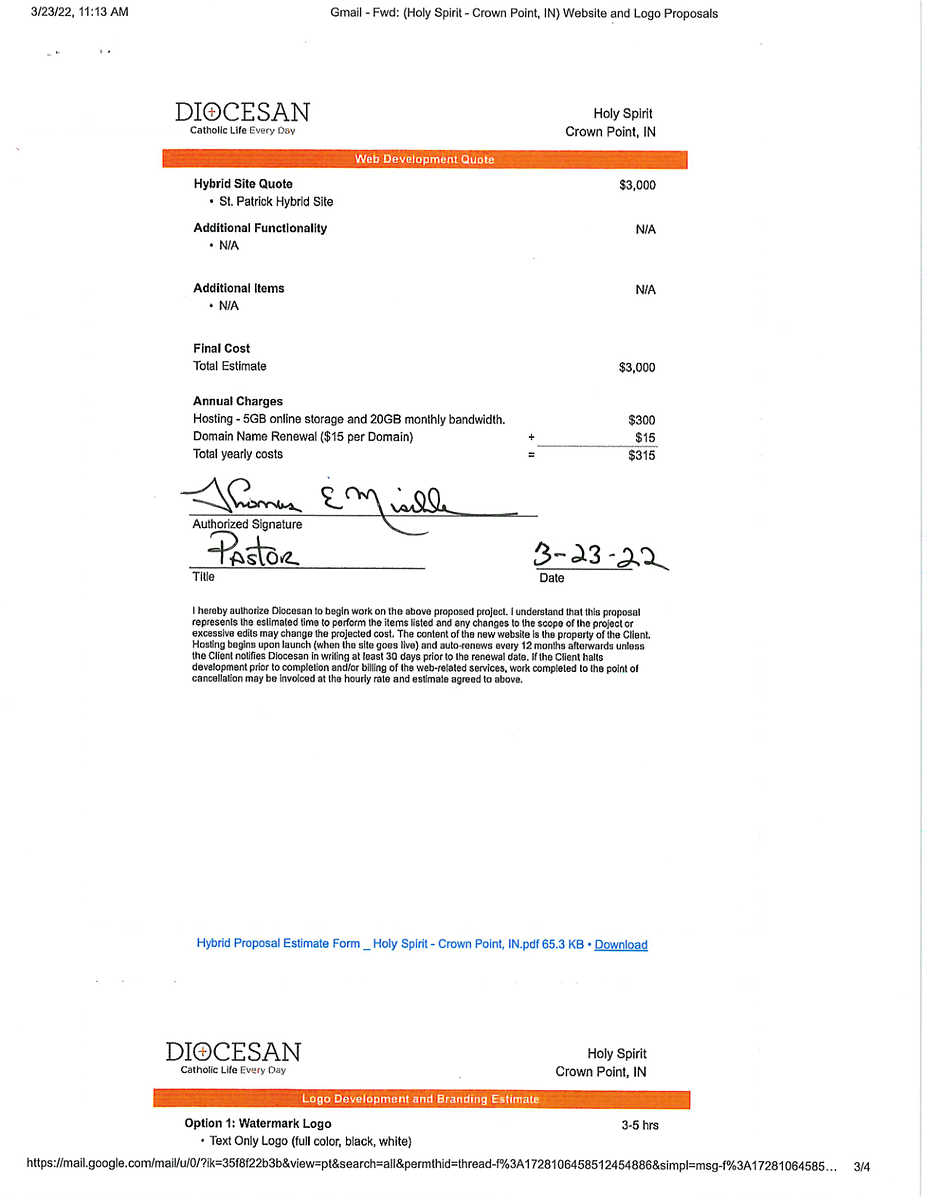 Thank you very much for the signed proposal. We are very excited to work with you to bring a new website to the Catholic Family of Holy Spirit, St Helen, and St Mary.