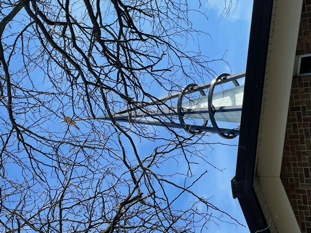 The school color is blue*. I think that’s why blue has been adopted by the parish although it does not compliment the brickwork here.
