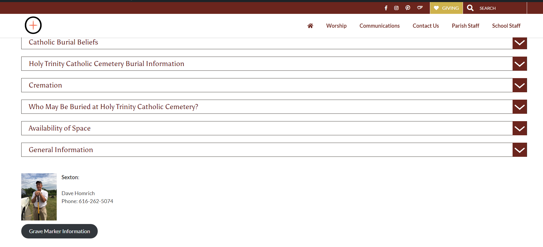 To-Do’s will have the following in the description:o Site URL: https://holytrinitycp.diocesanweb.org/about/our-campus/holy-trinity-cemetery/catholic-burial-information/o General Need: Button at bottom of the page isn't styled.o Description: Please style the button labeled "Grave Marker Information" at the bottom of the page.o Screenshots or Video: (optional)o If Paid Support, who approved the ticket?