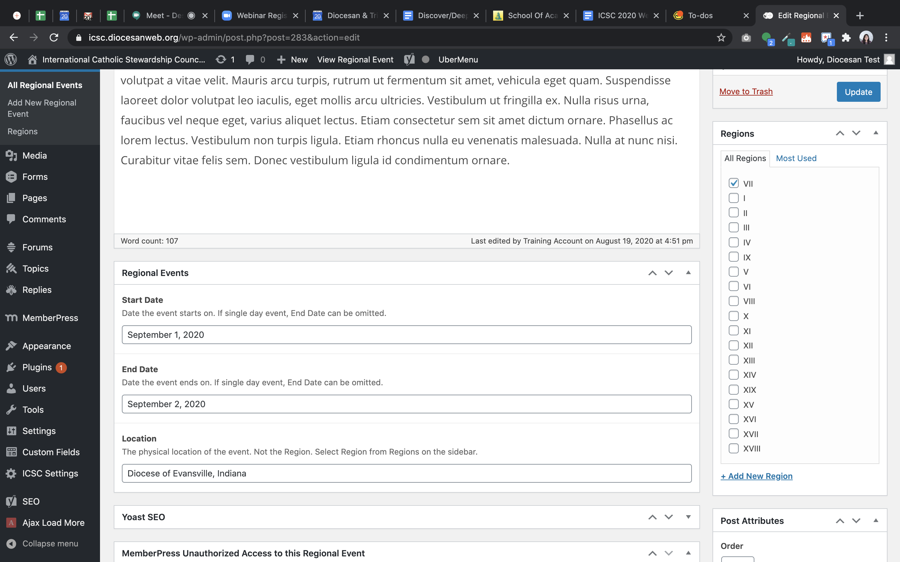 From the list: Other ✔ Upcoming regional events not displaying even when future date is put in. Veronica A. added this on Aug 20, 2020 Completed Aug 20, 2020 by Ryan R. Assigned to Ryan R. Notes https://icsc.diocesanweb.org/regional-event/region-vii-meeting/https://icsc.diocesanweb.org/upcoming-regional-events/ Screen Shot 2020-08-20 at 12.45.07 PM.png 541 KB • Download Comments & Events Ryan Ross completed this to-do. Aug 20, 2020 at 7:48 PM