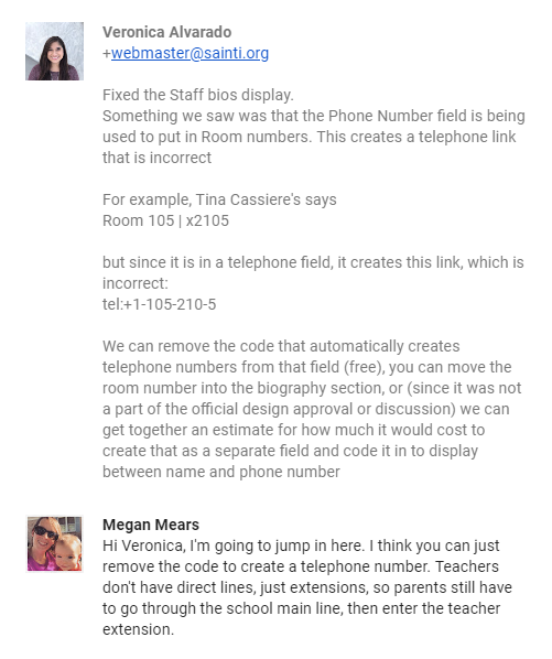 I'll use Tina Cassiere's information as an example. I can update the phone link creation function to automatically convert "Room 105 | x2105" into a link on "x2105" that has an href attribute of "tel:+1-513-389-3242;2105" that will dial the school's phone number with the extension. This would get a caller directly to Ms. Cassiere's direct extension without forcing them to navigate the phone system.