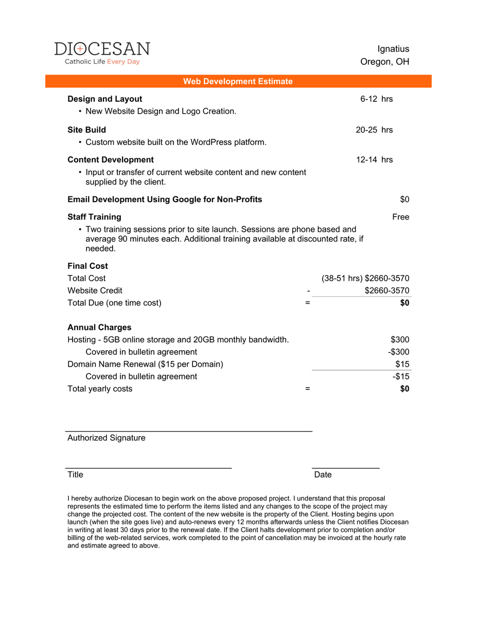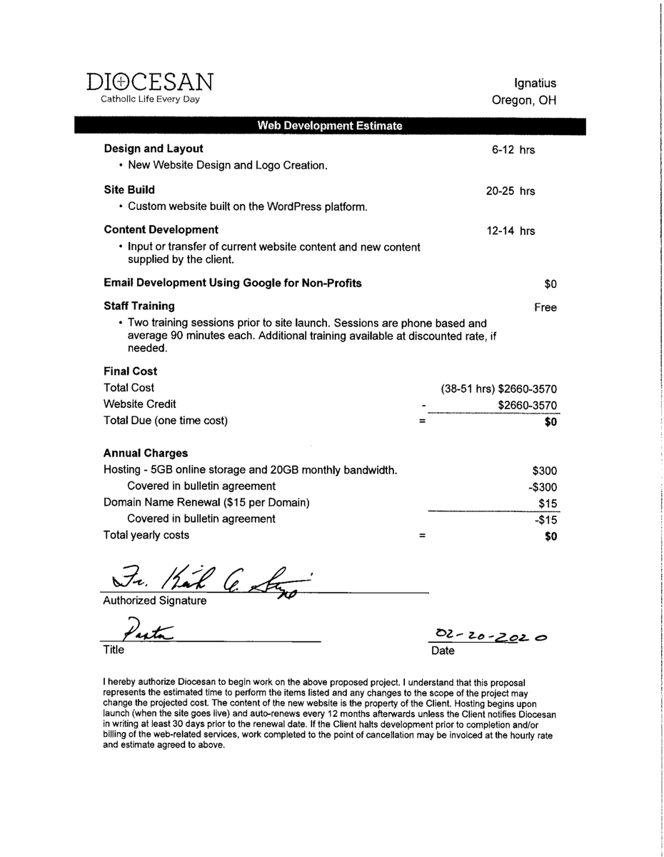 Attached is the proposal for you to review. I have itemized each step of the process so you can see what goes into each step and the amount of time we estimate it will take to complete. After discussions with my sales team, they let me know the cost of the website, the annual hosting of the website on our server, and the yearly renewal of your domain name (http://www.stiggys.org/) would be covered. I have included all of the details on the proposal for you.