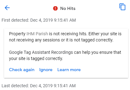 I am seeing this message in Analytics, but in realtime I can see myself as an active user on both school and parish sites. Is that what you were asking for? Sorry, this is still new to me.
