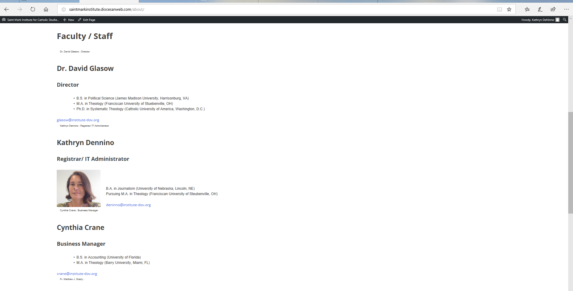 About page formating1- this formatting is off. The staff names appear twice in two different sizes, there's too much white space in between the names and titles. There's not enough space between the email and the next staff member's name/title (i.e. glasow@institute-dov.org<mailto:glasow@institute-dov.org> is right above Kathryn DeNinno: Registrar/IT Administrator. I had no "insert media" option to add a photo on this front About page. I was able to add it using html coding, but the positioning is off.