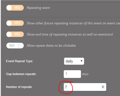 I’m attempting to list an event daily from September 4- Oct. 26. I’ve got the event set to “Event Repeat Type: daily” but it’s only listing on 2 days of each month. Can you check and tell me what I’m doing wrong? 😊