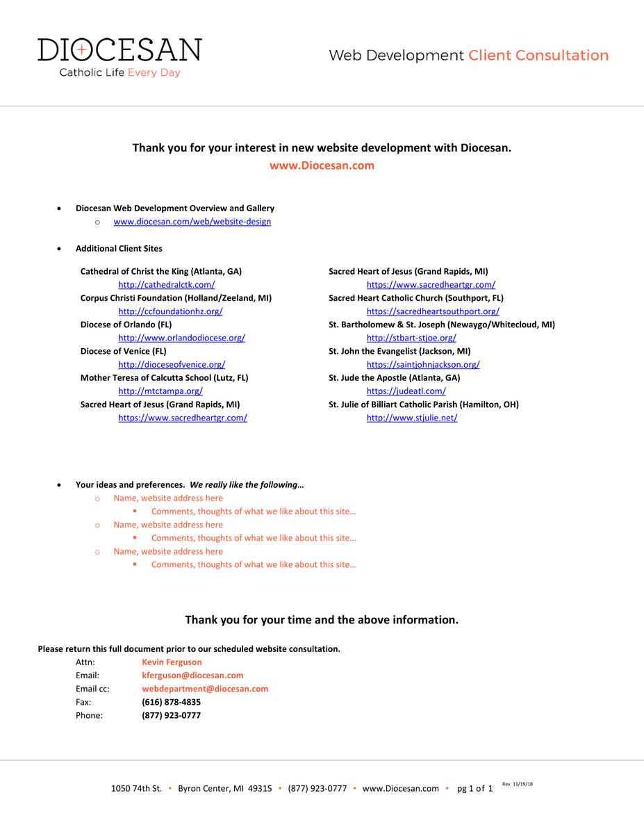 My name is Danae Chudy and I am the web designer at Diocesan Publications assigned to your project! I'm just emailing you to let you know about the design process. Currently, I have a few projects ahead of you in the queue but in the next few weeks, I plan on reaching out and setting up a design consultation. This consultation will give me a better idea of your vision for the website and other design elements you require. Please let me know if you have any questions in the meantime.
