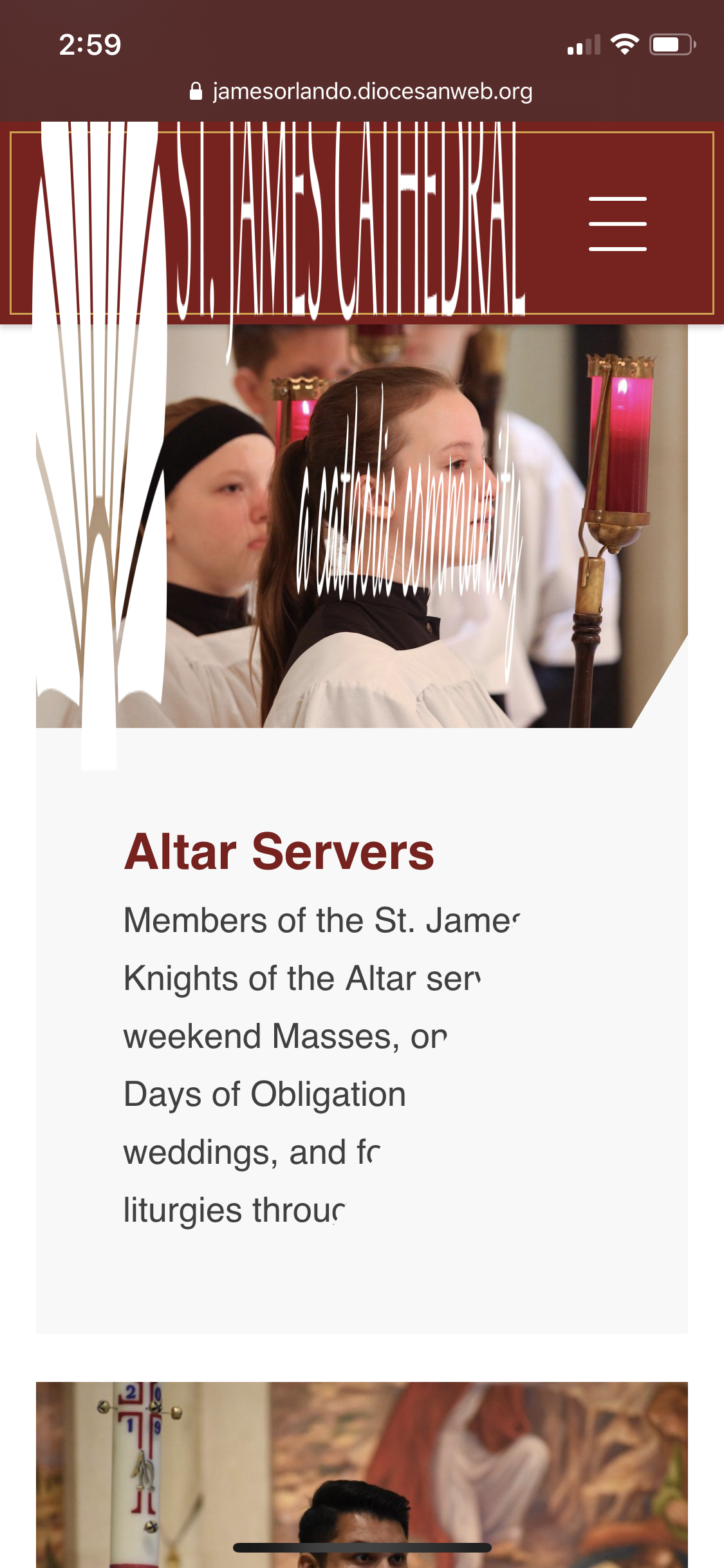From the list: Mobile ✔ 1002- diagonal boxes needs formatting for mobile Veronica A. added this on Jul 01, 2020 Completed Jul 02, 2020 by Kyle B. Assigned to Kyle B. Notes https://jamesorlando.diocesanweb.org/worship-ministries/ IMG-1002.PNG 3.97 MB • Download Comments & Events Kyle Brown completed this to-do. Jul 02, 2020 at 6:36 PM