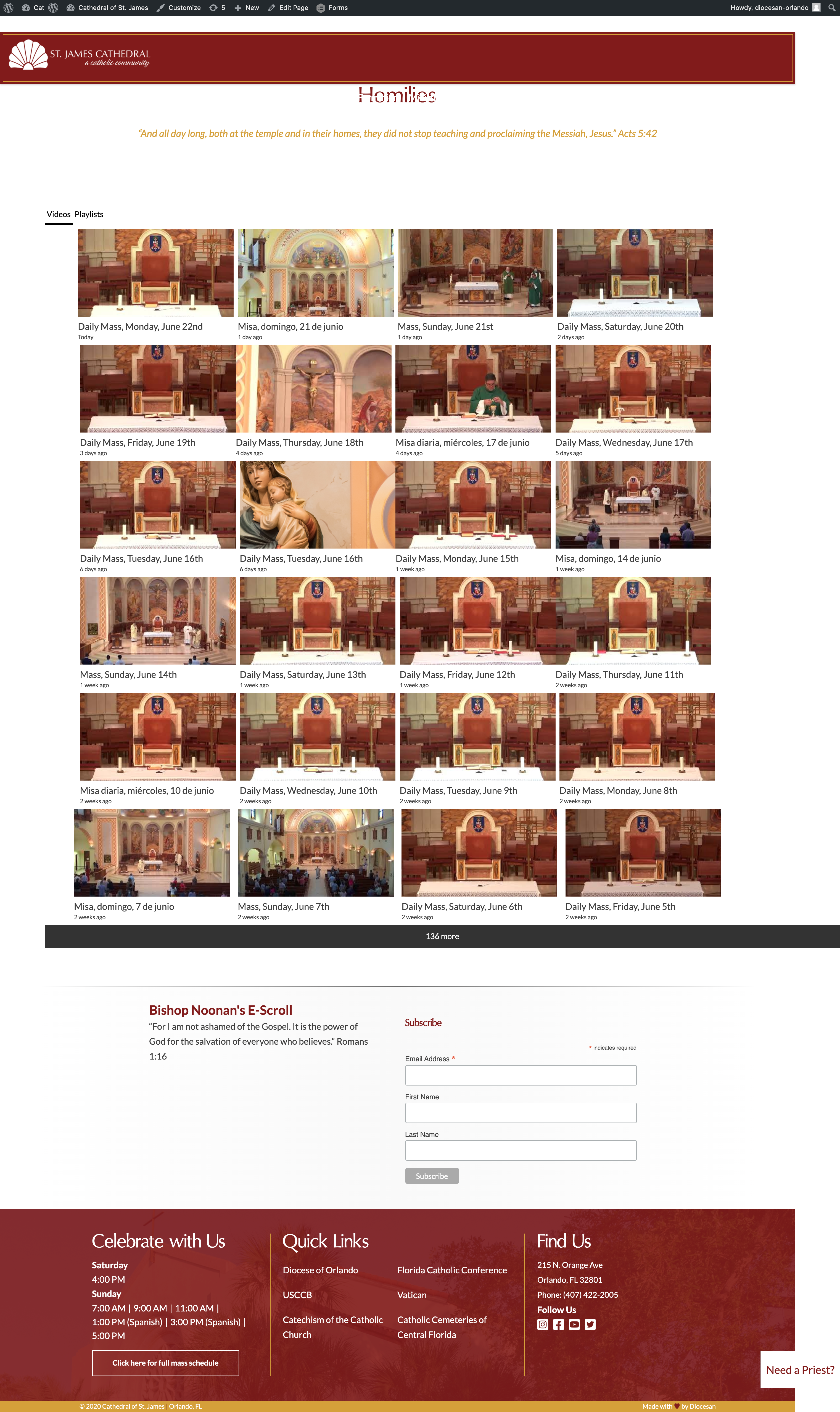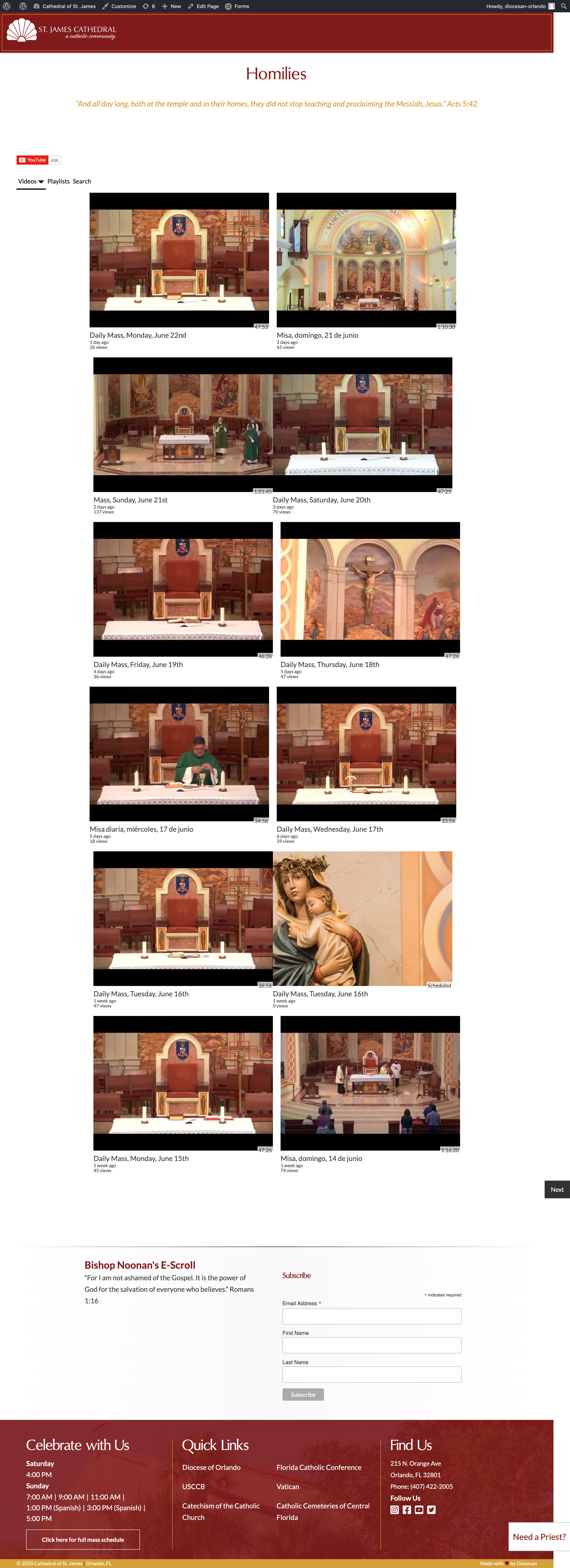 From the list: Inner Pages ✔ Homilies - Plugin videos not displaying correctly (video padding off) Veronica A. added this on Jun 22, 2020 Completed Jun 25, 2020 by Kyle B. Assigned to Kyle B. Notes https://jamesorlando.diocesanweb.org/homilies/ screencapture-jamesorlando-diocesanweb-org-homilies-2020-06-22-16_05_14.png 9.66 MB • Download image001.png 784 KB • Download Comments & Events Veronica Alvarado, Project Manager I think by changing the width of the page, it's causing the breaks sooner than the columns. Here, I have set the columns to 3, but the videos are sucked into the space, so every 3 the spacing is off. screencapture-jamesorlando-diocesanweb-org-homilies-2020-06-23-15_29_00.png 11.3 MB • Download Jun 23, 2020 at 8:37 PM Notified 1 person Kyle Brown completed this to-do. Jun 25, 2020 at 4:45 PM