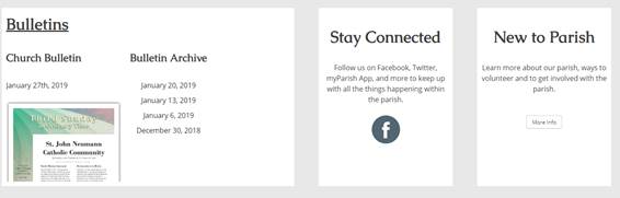 Bulletin/Stay Connected/New to Parish: On Wednesday we talked about having this be converted to three equal size boxes, 1/3 for bulletins, 1/3 for the calendar, and 1/3for is a post. Do you have an approximate time for this change to be made?