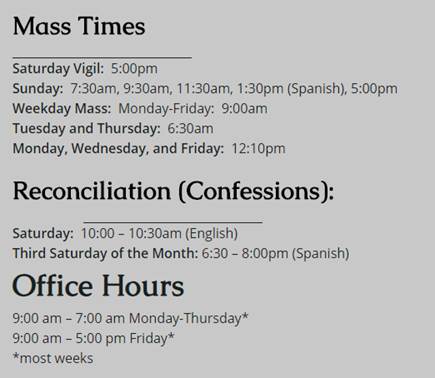 I also noticed the Mass and Office times is now free form but it is not clear what controls the lines that appear. I looked at the html view and it was not obvious to me. I also wasn’t sure what impacts the size that Office Hours is larger (or appears to be larger) than Mass Times and Reconciliation.