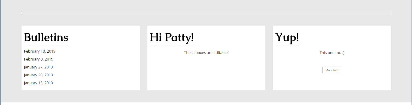 We also want to know how to link URL to text in the message section of the 3rd box so it operates more like the events widget on our current home page. We don’t need it that fancy, we would change the event and link the URL as appropriate if we knew how.