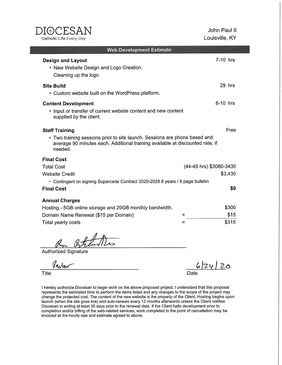 I just received and invoice for the website for $4300. The contract that Fr. Peter signed said no cost. Not sure why I received this invoice. Our Account # is 106011. Please look this matter for us. Thanks.