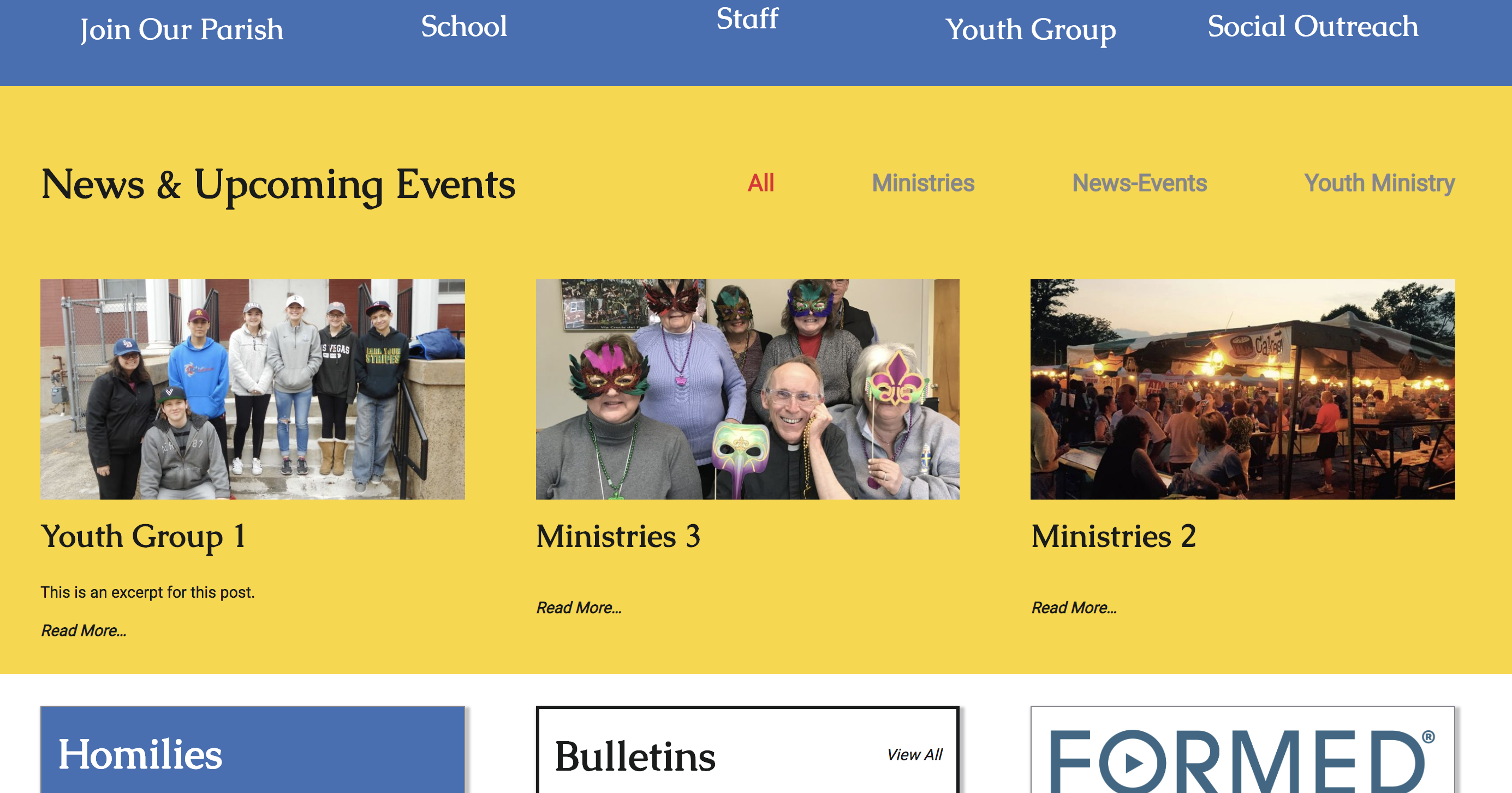 As seen above, your news & events already exist on the homepage. During the training, we will go over how to add and remove post categories from displaying on the homepage.