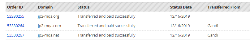 Katie, I am working on unlocking the domains so they can be transferred. After that (maybe tomorrow) I will see if I can provide you with the authorization codes for jp2-mqa.com, jp2-mqa.net, jp2-mqa.org. The transfer process may or may not disrupt the website and any @jp2-mqa.org email accounts.
