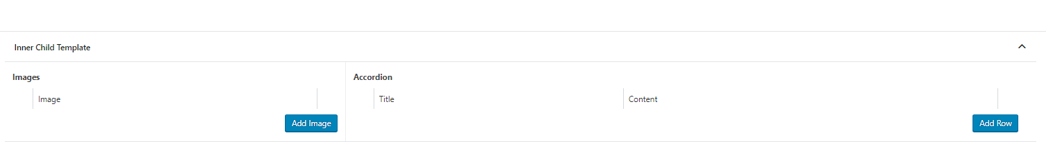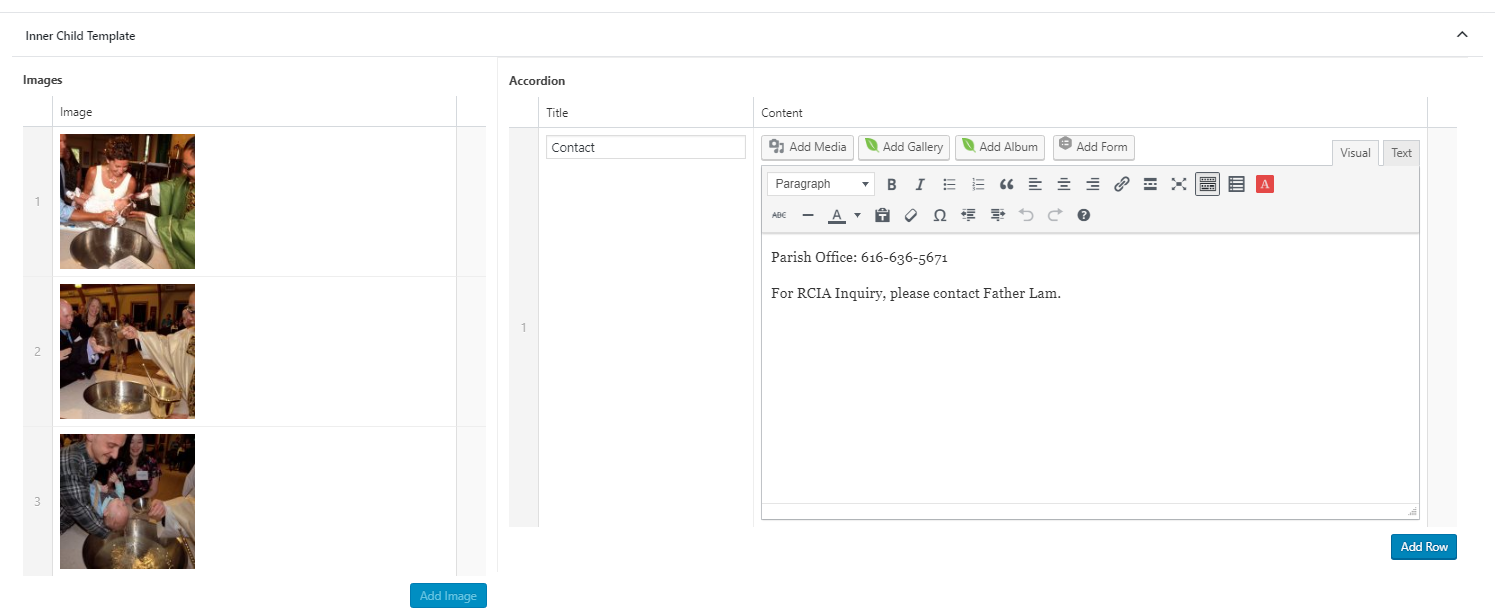 Once you reload the page, you should see the Inner Child Template areas appear below. This is where you may add the images that will display on the slider and the accordion content. This information will display on the Men's Ministry page, along with the first couple of lines of whatever content you add to the actual page.