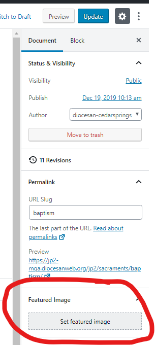 This may be done by editing the page you are on and adding a Featured Image, found in the Document Settings bar on the right. - Changing Images for Each Sacrament
