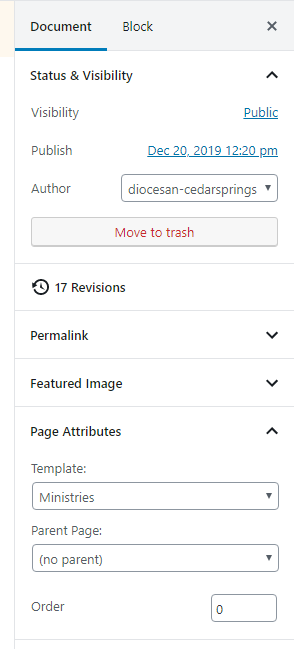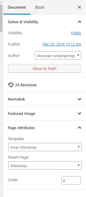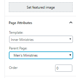 The first thing you will need to do is add the page title, Update the Page Attributes Template to Inner Ministries and Parent Page to the ministry section. (In this case, Men's Ministries.)