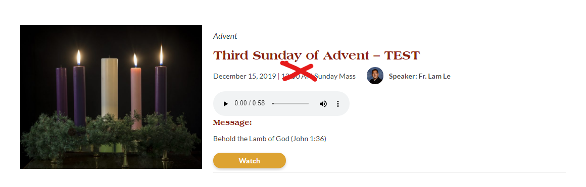 From the list: Homilies ✔ Remove the time of day from single post Veronica A. added this on Jan 27, 2020 Completed Jan 28, 2020 by Kyle B. Assigned to Kyle B. Notes https://jp2-mqa.diocesanweb.org/st-john-paul-ii-parish/homilies/third-sunday-of-advent/ image.png 193 KB • Download Comments & Events Kyle Brown completed this to-do. Jan 28, 2020 at 2:16 PM