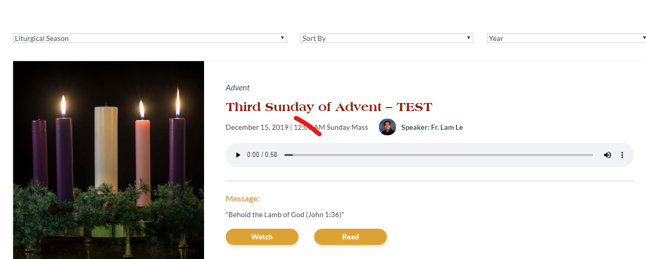 From the list: Homilies ✔ Remove time of day from post archive Veronica A. added this on Jan 27, 2020 Completed Jan 28, 2020 by Kyle B. Assigned to Kyle B. Notes https://jp2-mqa.diocesanweb.org/st-john-paul-ii-parish/homilies/ image.png 252 KB • Download Comments & Events Kyle Brown completed this to-do. Jan 28, 2020 at 2:21 PM