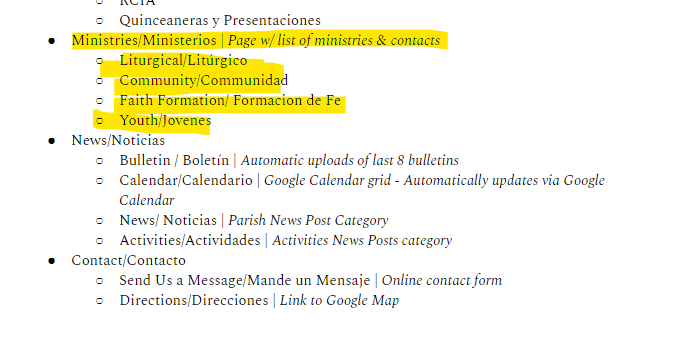 From the list: Content ✔ Categorize ministries into the 4 groups to match design Veronica A. added this on Sep 30, 2019 Completed Oct 04, 2019 by Veronica A. Assigned to Cody A. Notes Did we do this already? Or do we need to rework with them? Comments & Events Cody Armock, Web Content Specialist Looks like they are in Four Categories from the Suggested Sitemap, but I see that you changed this. So, is this still applicable? image.png 56.8 KB • Download Sep 30, 2019 at 5:35 PM Notified 1 person Veronica Alvarado, Project Manager yeah I just updated it to work.We need to reach out to them soon and see if they are ready because we're starting to build their site this week 💪 Sep 30, 2019 at 5:56 PM Notified 1 person Cody Armock, Web Content Specialist I saw that you sent out the suggested sitemap email follow up. I will send a follow up about fold vs aspect ratio. Sep 30, 2019 at 6:26 PM Notified 1 person Veronica Alvarado, Project Manager I was just going to do fold since that's what the mockups are Great Job!💰🥇 Oct 02, 2019 at 8:46 PM Notified 1 person Cody Armock, Web Content Specialist They went with Page Fold anyway because "we"/"I" recommended it and I am the professional. LOL 💪 Oct 03, 2019 at 11:56 AM Notified 1 person Cody Armock, Web Content Specialist Veronica can this to-do be closed then? Oct 04, 2019 at 1:50 PM Notified 1 person Veronica Alvarado completed this to-do. Oct 04, 2019 at 1:53 PM